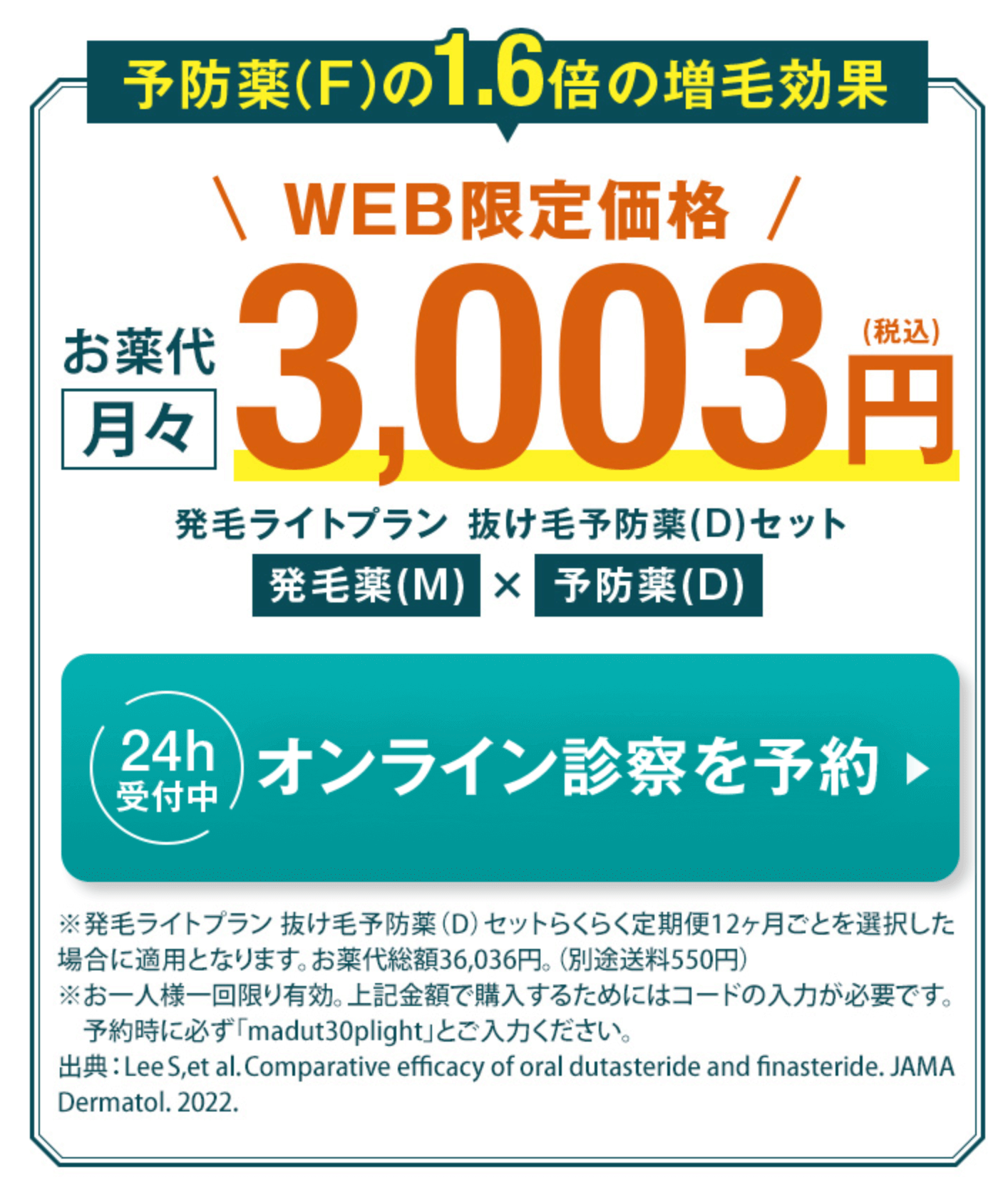 ※2:発毛ライトプランデュタステリドセット 定期便12ヶ月ごとを選択した場合に適用。総額36,036円(別途送料550円)