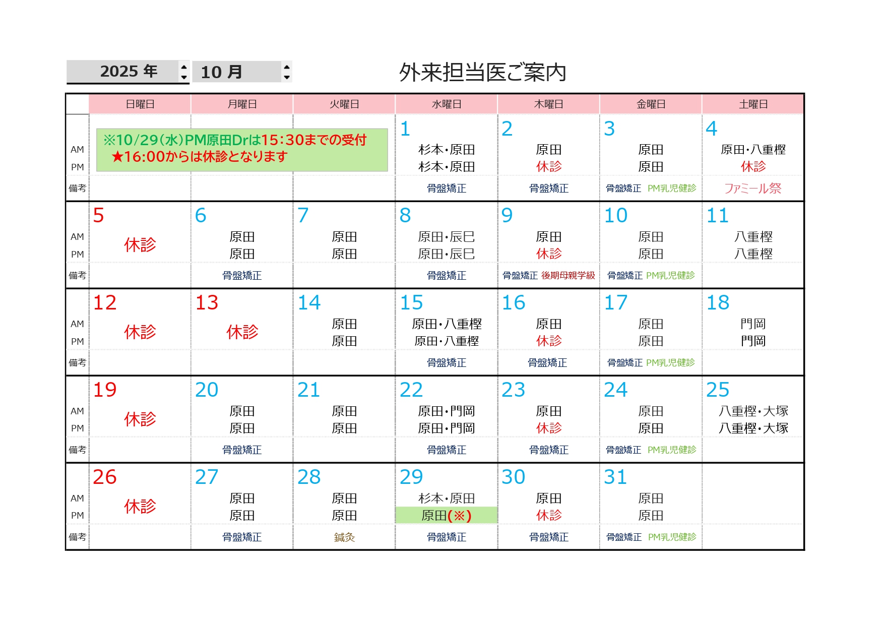 ★10/29(水) PM原田Drは15:30までの受付、※16:00からの診療は休診となります